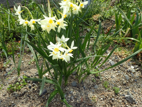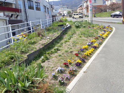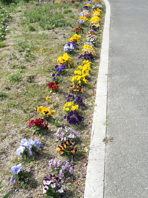 花壇には春の花が満開で